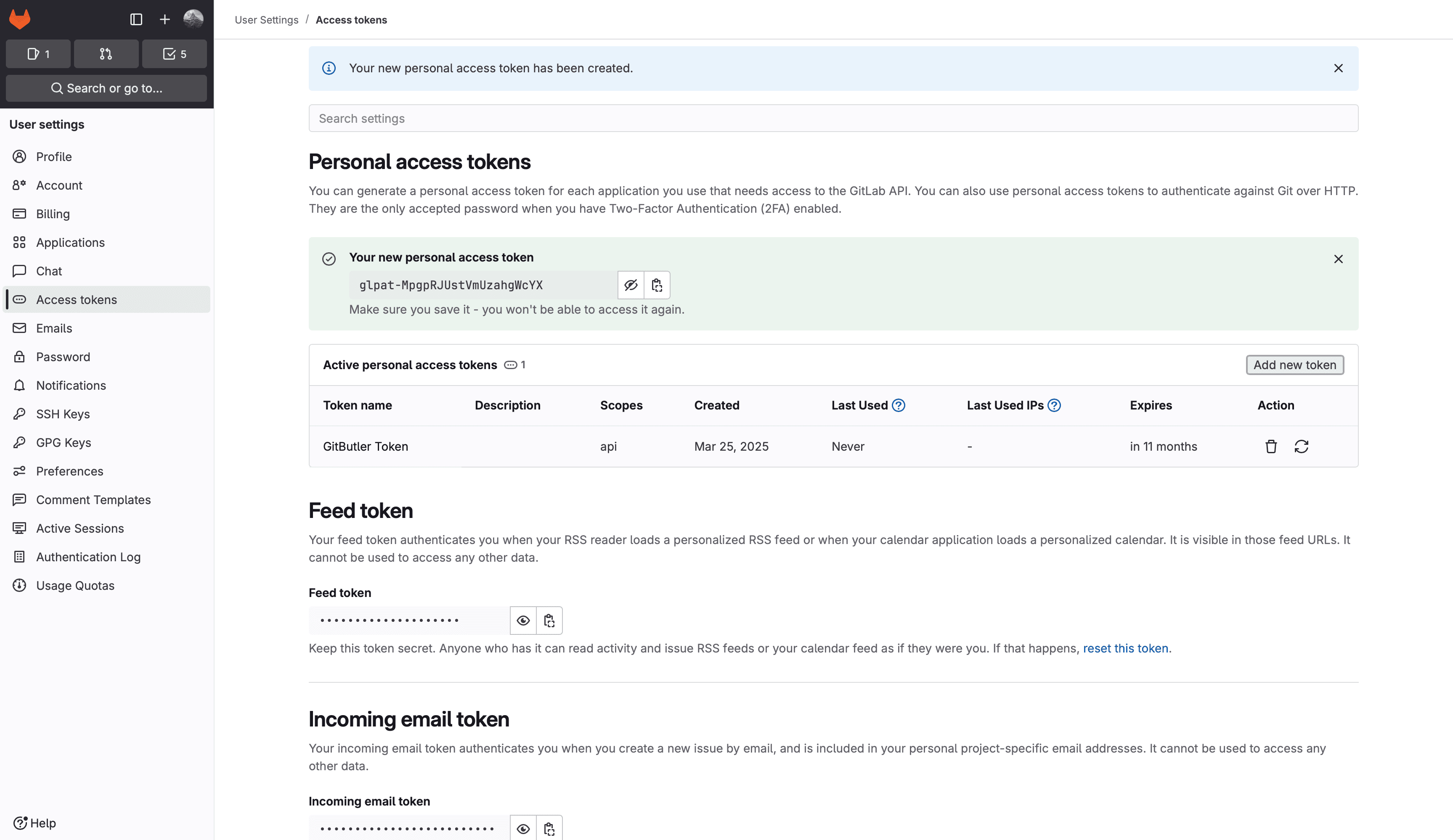 On completion, you will be showen the following screen which contains your GitLab Personal token.